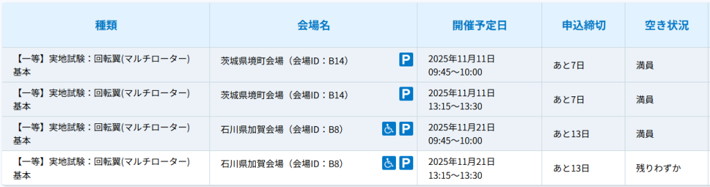 参考までに、2025年10月8日時点で受験申込ができる一等・基本の実地試験は、以下のとおりです。