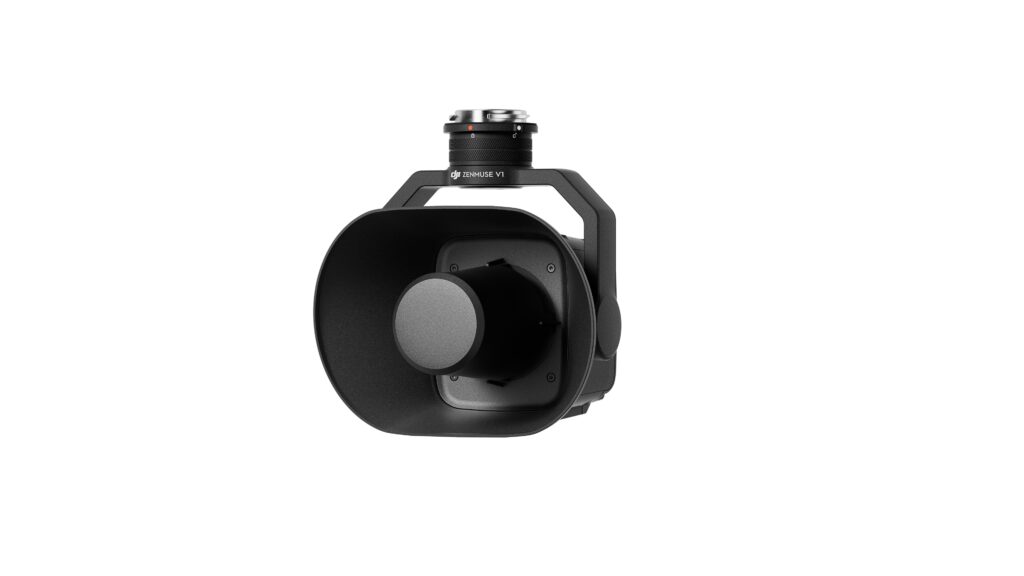 DJI Zenmuse V1は、ドローン用高性能拡声スピーカーです。最大音圧レベルは110 dB @ 1m、最大有効放送距離は約100mで、遠方でもクリアにメッセージを届けます。内蔵のテキスト読み上げ機能やリアルタイムライブ放送に対応し、災害時の避難誘導、捜索救助、公共の安全など、迅速な情報伝達が必要なシーンで活用されます。